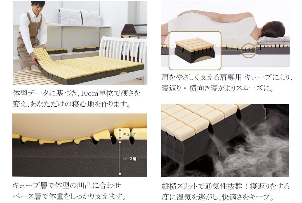 当初は「神経痛で首肩が痛くて手も痺れる」とのことで、「枕を変えれば少しでもマシになるのでは…」とご家族が心配されてオーダーメイド枕をお試しご希望のご来店でした。自身も経験してきた状況でしたので、お客様のお辛い気持ちがとても伝わってきました。カウンセリングする中で、綿敷布団でおやすみされているとのこと。横向きに寝た時の肩の痛みや腕の痺れで眠れなかった私から、是非試していただきたい!とご案内したのが、FITLABOのオーダメイドマットレス↓