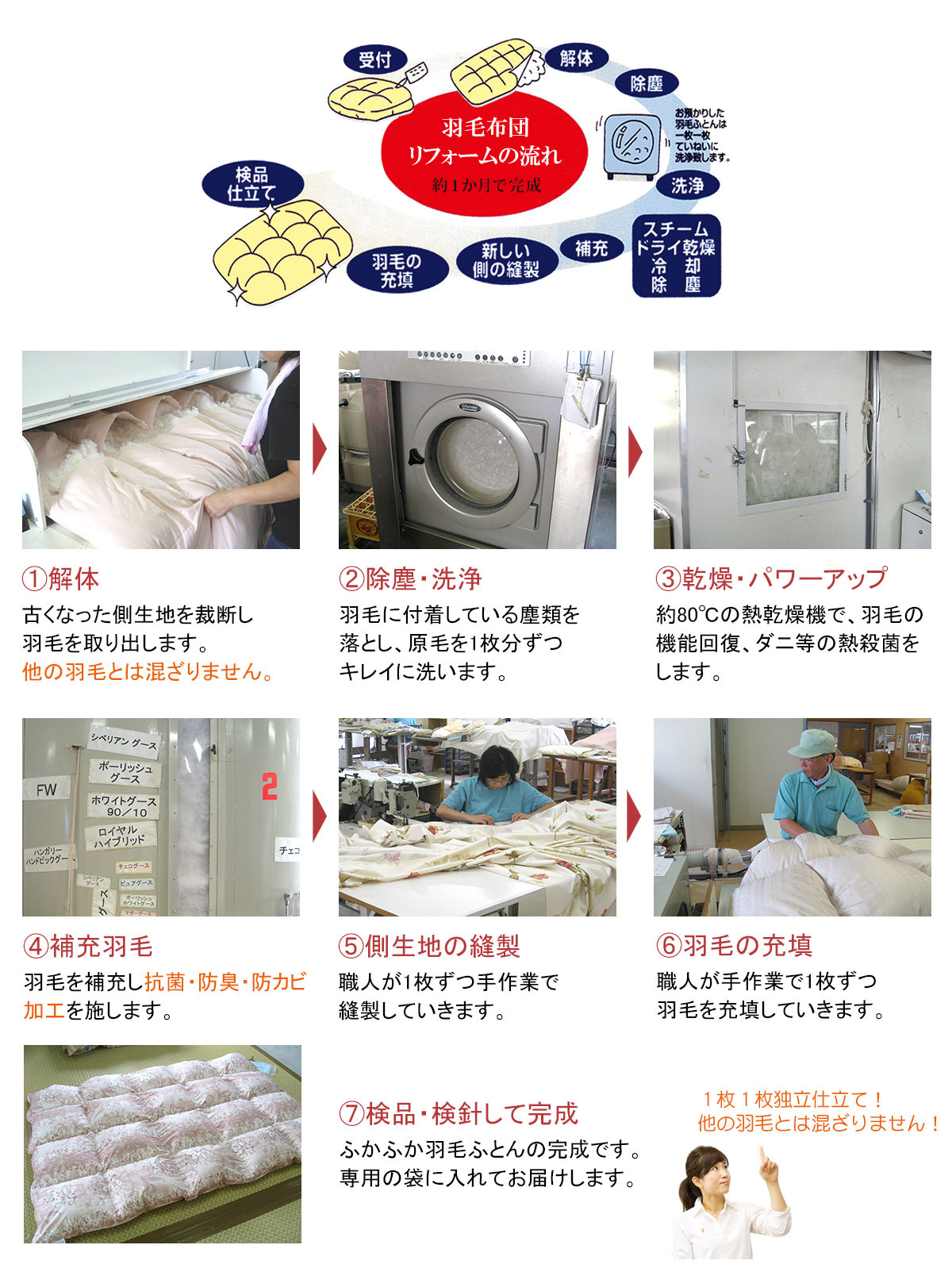リフォームの工程に「洗浄」工程があります。中の羽毛を一度全て洗いますので大変きれいになります。